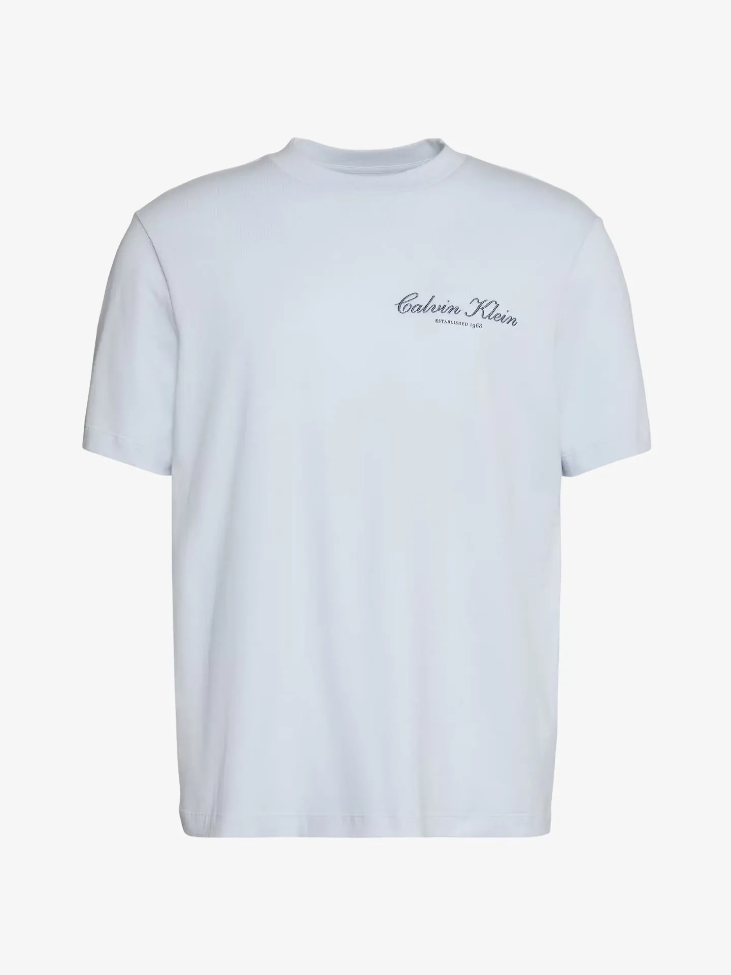 Wit T-shirt van het Amerikaanse merk Calvin Klein. Het T-shirt in de kleur Plein Air heeft een ronde hals, korte mouwen en een opdruk aan de linker voorzijde van het shirt.